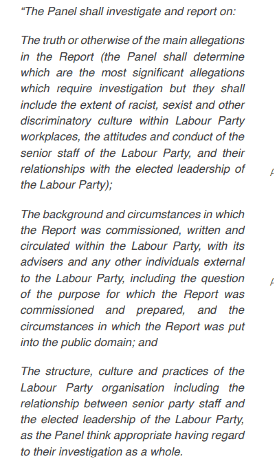 This is in fact quite a peculiar statement. First, as stated, it seems highly concerning that those involved seemed to be seeking to revisit things covered by a genuinely independent organisation with a panel made up of Labour Party members of the House of Lords was peculiar in the firs place. Secondly, it seems to conflate together different tasks, an investigation into a leak, an investigation into the reasons for a report being written, when those reasons were a matter of public knowledge and finally the issues concerning publication and leaking of the report. A tighter scope would have been helpful.