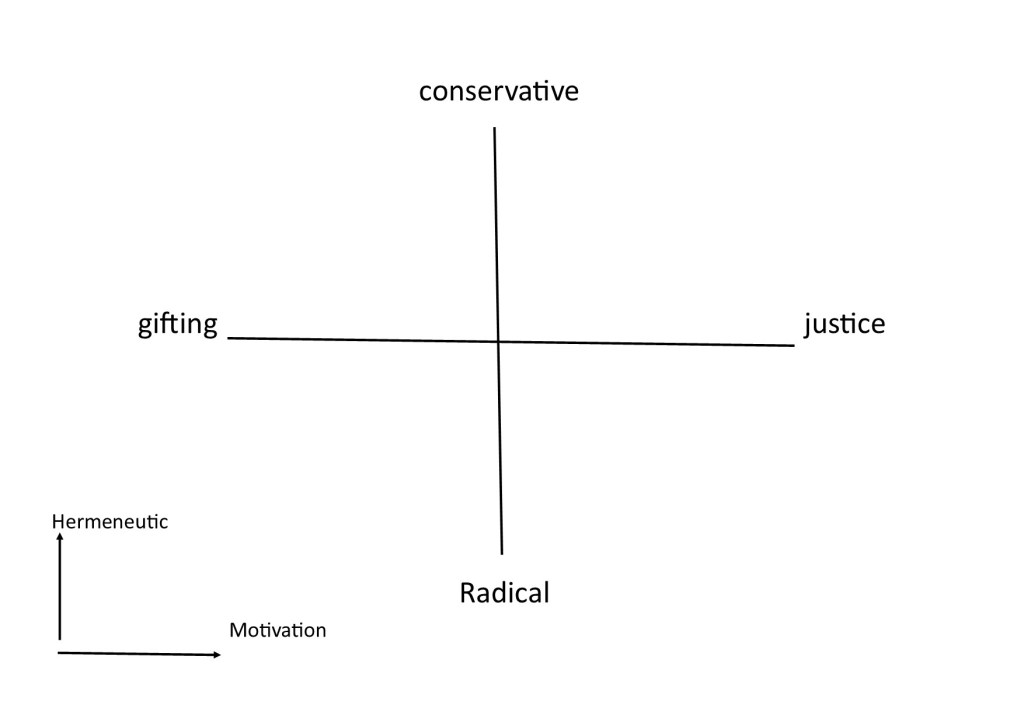 Secondly, we will want to think in terms of hermeneutics. I am focusing purely on evangelical egalitarianism here. So, we are talking about those egalitarians who would seek to justify their position and practice from Scripture. They take the authority of God’s Word seriously. Some egalitarians have felt that a new hermeneutic, or framework for interpreting Scripture is necessary, especially if we are to engage with issues of justice. Therefore, a lot of egalitarian arguments are based on what has become known as the “Redemptive-Movement-Hemeneutic”. This approach argues that through history, we see a movement or trajectory in ethics that is based on the principle of redemption. This means that we see the effects of God’s love and healing at work. It means we will see progression in Scripture but also beyond Scripture. From this perspective, inequality between the sexes is a result of The Fall. In that respect, there will be some agreement between egalitarians holding to this perspective and some complementarians who argue their position in part from one interpretation of Genesis 3:16. We might, for simplicity refer to this as a radical hermeneutical position.