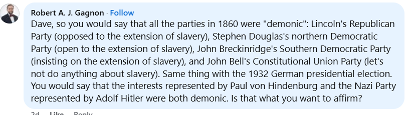“Those who say that there is no specialized sense in which a political party can be called demonic, no matter how evil, are stuck in a position that makes it impossible for Christians to single out the Nazi Party in 1932 as demonic because they could argue that Hindenburg had his own demons (having commanded Germany’s military in WWI). Or the Democratic Party in 1860 for its obsession in preserving and spreading slavery, as if the Republican Party under Lincoln was also demonic for its errors and insufficiencies. I do not think that this is a workable option””