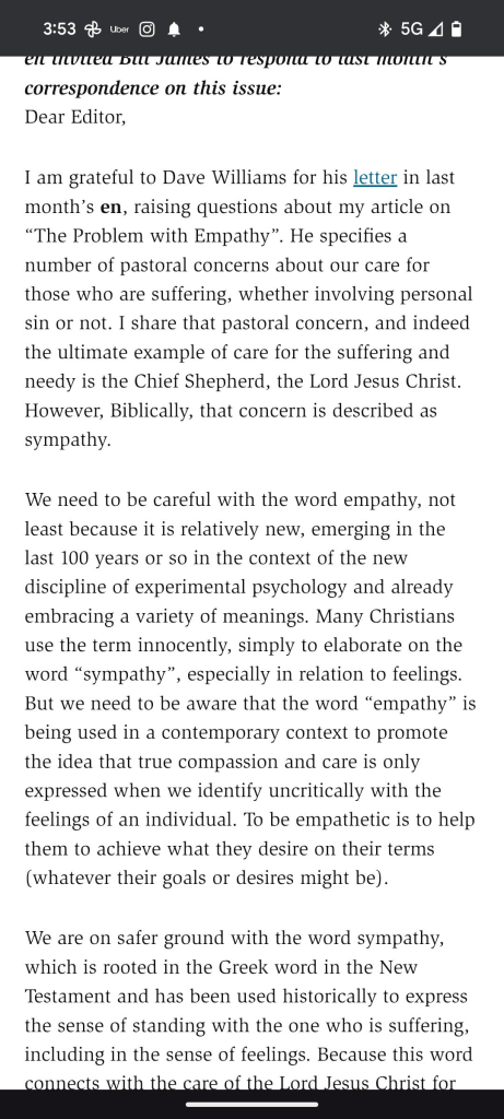 Readers may recall that I responded to an article in Evangelicals Now by Bill James where he talked about “the problem with Empathy”. Well, James has offered a brief response in this month’s EN.